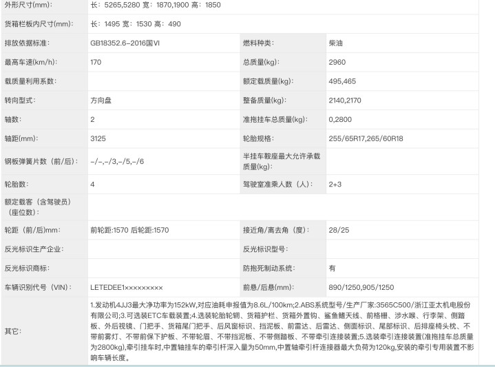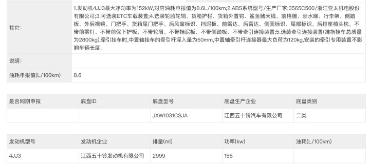 9月的工信部目录中,江西五十铃已经为D-MAX申报了代号4JJ3的柴油发动机,排放标准已经符合国内法规要求。而最新一期的工信部名单里,五十铃D-MAX给出更多相关信息。
