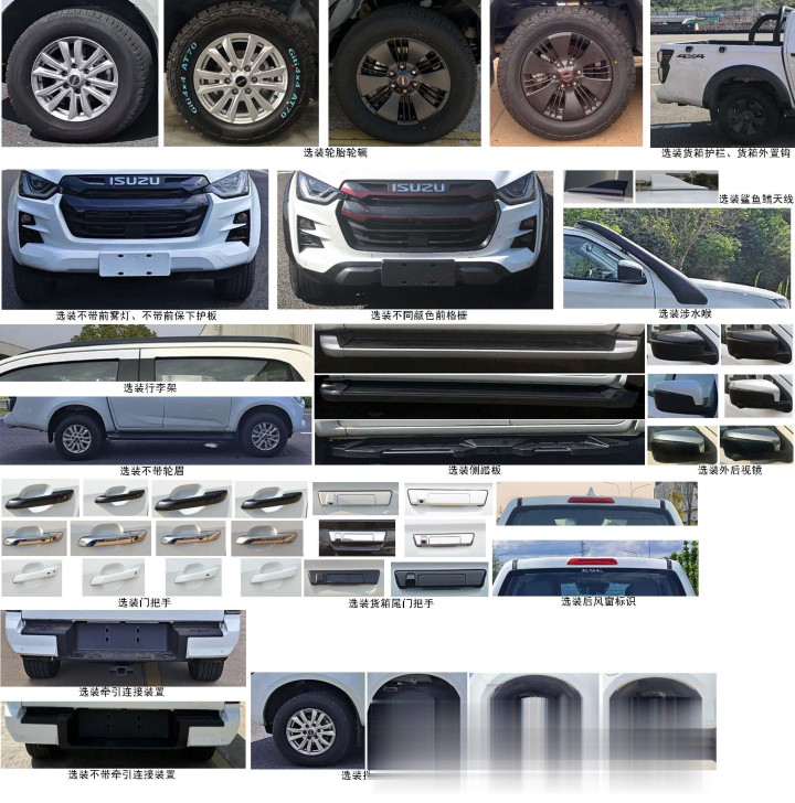 根据用途不同,D-MAX的3.0T车型应该也会区分钢板弹簧和多连杆两种非独立后悬结构,前悬则均采用双叉臂独立架构,并提供分时四驱系统。轮胎方面,依然是255/65 R17和265/60 R18两种规格,轮辋也有银色多幅和熏黑宽幅两种风格。同时,江西五十铃会提供涉水喉、货箱护栏、双色前格栅、行李架、轮眉防擦条、侧踏板和黑色外观套件等多种选装。